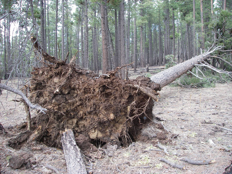 4) Trees left standing after most trees are dead or fallen over. Lone trees that may be surrounded by similar-sized downed trees could be an indicator that something is happening, or has happened, in that stand (common group of trees) of trees. What you might not realize is the remaining trees were established in a much denser stand that were adapted to less windy conditions because there were so many more trees to distribute the force of the wind; therefore, there is now a much greater wind force on the remaining trees.